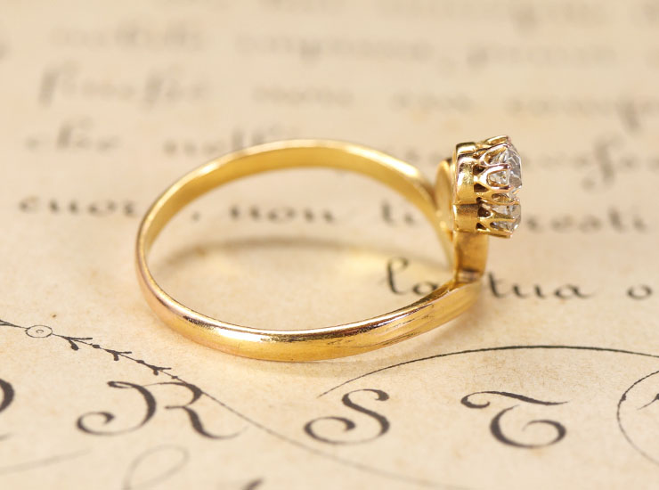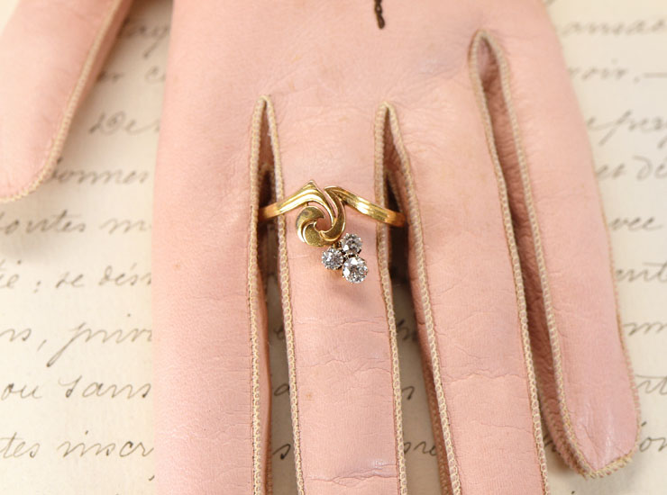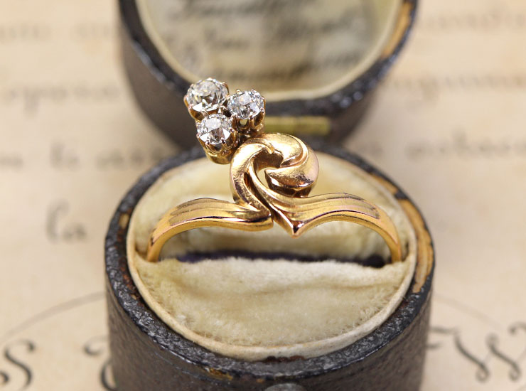 1890年頃のアンティークリングです。流れるようなアールヌーヴォーのデザインに輝きの強いオールドヨーロピアンカットのダイヤモンド3石が花のようにセットされた格別に美しいリングです。ダイヤモンドの輝きがうまく撮影できなくてもどかしいのですが、本当によく輝くダイヤで、薄暗いレストランなどでおつけいただくと僅かな光さえ引き寄せて美しい輝きを見せてくれることでしょう。