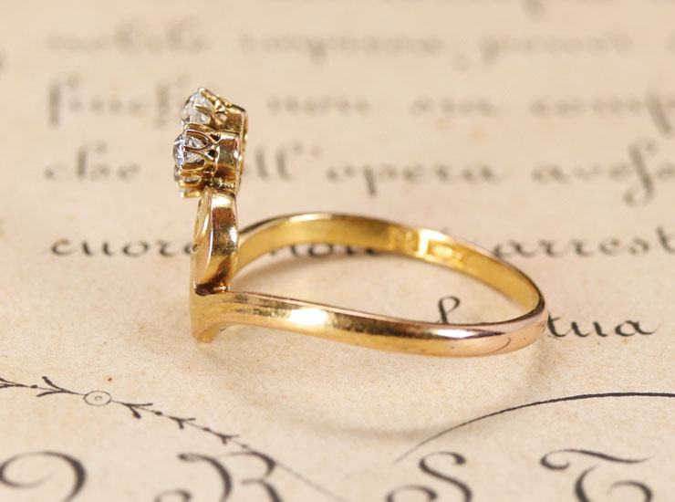 リングに「18」と18金を示す刻印、魚のマーク入り。アールヌーボー18金ダイヤモンド3石リングは良い状態です。