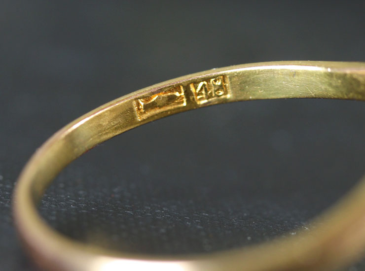 刻印の写真を掲載していますが、今まで見たことのない刻印です。18金を示す「18」の数字の横に「魚」のマークが入っています。これ程ハイクォリティのリングですので、有名な工房で作られたリングではないかと色々調べましたが、ヨーロッパだけでも非常に多くの刻印がありますので特定ができませんでした。どんな素敵な貴婦人が所有していたのかしらと想像をかきたててくれる素晴らしい逸品です。