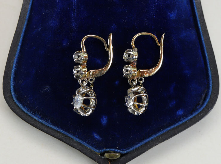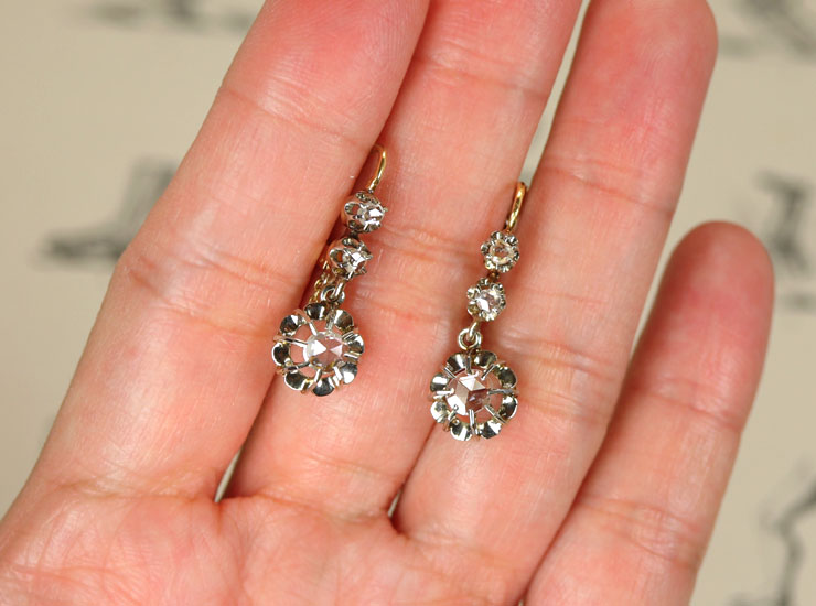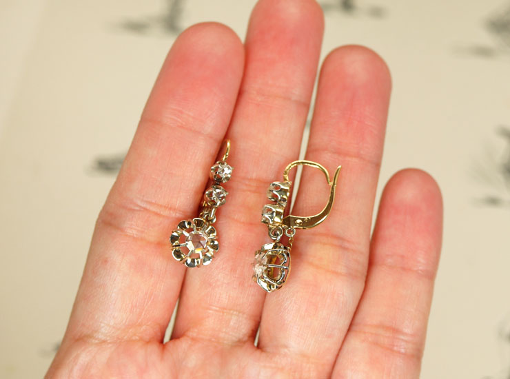 地金はダイヤのセッティング部分は18金ホワイトゴールドで、それ以外は18金イエローゴールドです。メインのダイヤの大きさは約4ミリ×3.6ミリで、上2石はほぼ同じ大きさで約2ミリ。(すべて当時のローズカットで、現代のダイヤモンドとは違い、完全な円形ではないため大体の大きさとなります。)ピアスは留め具が上下に開閉するレバーバックタイプ。繊細なピアスに見えますが、しっかりと厚みがあり丈夫な作りです。大変美しい輝きでアンティークダイヤモンドの魅力が堪能できるピアスです。