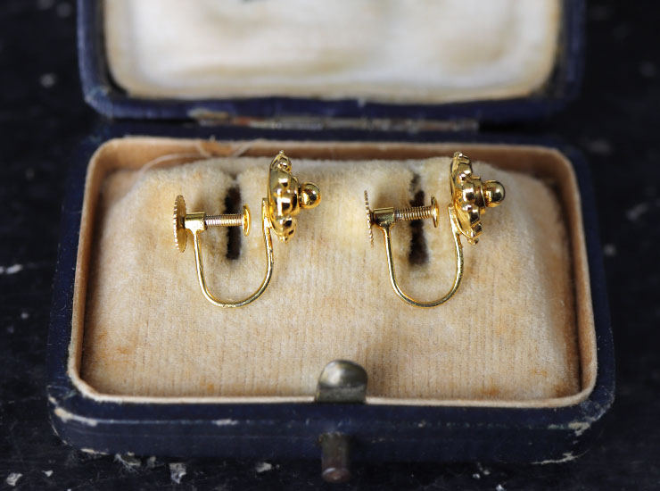 1960年のイギリス製ヴィンテージイヤリング。エトラスカン・デザインの小さいけれど、スタイリッシュなイヤリングです。モチーフは直径9ミリで、留め具はネジ式になっています。モチーフは中が空洞で、耳に負担がかかりにくい重量が軽い作りです。地金はモチーフ、ネジ部分すべて9金。綺麗な明るいゴールドで程良い華やかさを添えてくれます。