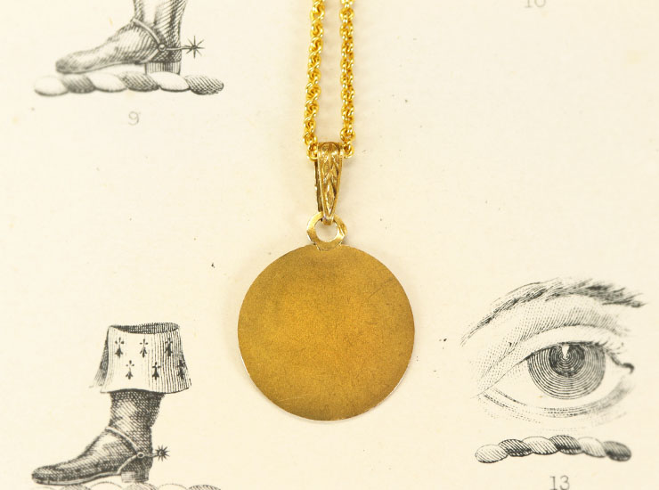 地金は18金。厳かな雰囲気のメダイにぴったりな艶を抑えたマットな質感のゴールドで、色もやや渋めのイエローゴールドです。直径21ミリ。バチカンまで含めた長さは31ミリ。