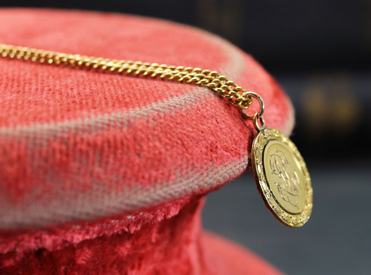 1900年頃のフランス製アンティークペンダントです。表にはモノグラム、裏には1923年8月27日の日付が美しく彫られたペンダントです。周囲はガーランド(花飾り)が囲んでいます。小さなペンダントですが、アップの写真をご覧頂いてもお分かりになるように、細工も細やかで美しく手彫りも丁寧に施されています。地金は18金。ペンダントの直径は18ミリ。