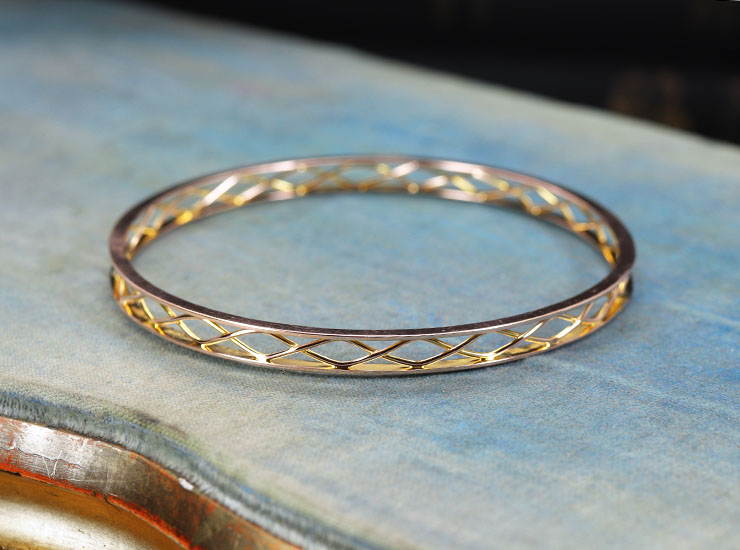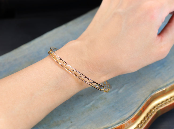 1920年頃のイギリス製アンティークバングルです。留め具のない手首から通して着用するタイプのバングルです。菱形の幾何学模様の細工がぐるりと連なったどこかモダンなデザイン。一見シンプルなデザインですが、実際に手に取り着用すると、丁寧に作られた上質なバングルということが分かります。