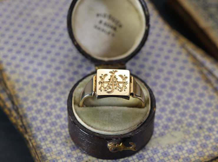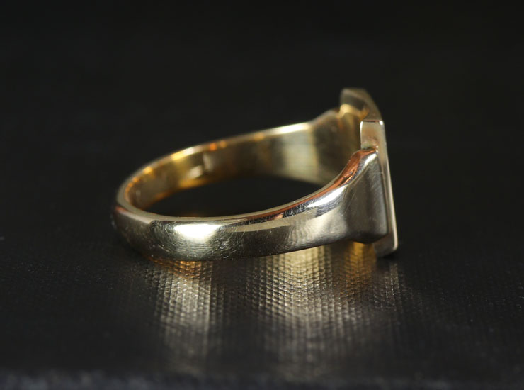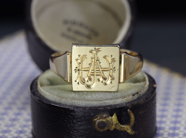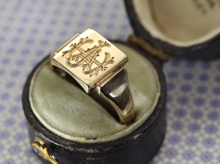1941年-1942年のイギリス製ヴィンテージシグネットリングです。正方形のシャープな面持ちが格好良く、着けやすいデザインです。地金は9金イエローゴールド。フェイスは10.5ミリ×10.5ミリ。掲載写真では傷が少々目立って写っていますが、実物はホールマークもくっきりと残り、使用感も少なく大変良い状態です。