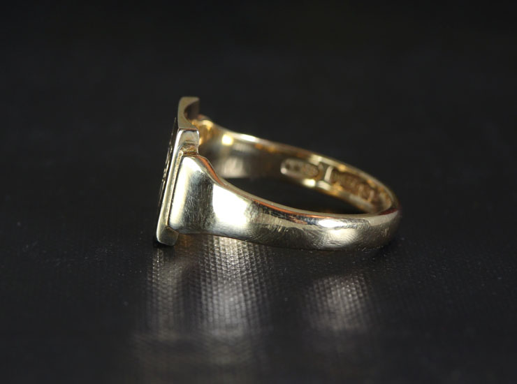 リングに9金、1941年・1942年を示すイギリスのホールマーク(刻印)、メーカーマーク入り。ヴィンテージ9金シグネットリングは良い状態です。
