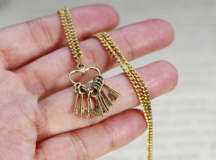 1960年頃のイギリス製ヴィンテージチャームです。ハートに小さな鍵がじゃらじゃらと付いたユニークなデザイン。鍵の先が「I LOVE YOU」の8文字になっています。「Y」の鍵が折れ曲がってヒビが入っています。また「U」の文字が半分取れてしまっています。着用時にはまったく目立ちませんが、特別価格にてご提供させていただきます。地金は9金です。