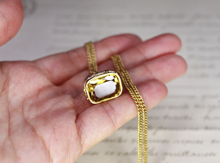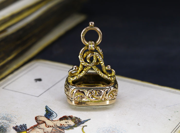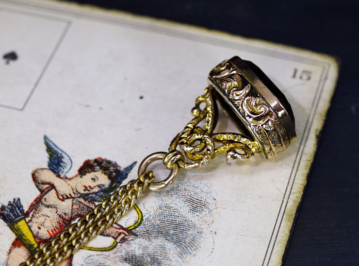 地金は9金。ややピンクを帯びた綺麗なゴールドです。ペンダントには2か所にホールマーク(刻印)が入っています。このようなタイプのアンティークフォブシールにホールマークが入っていることは少なく、ゴールドのものでもホールマークが入っていないことが多いです。