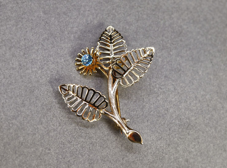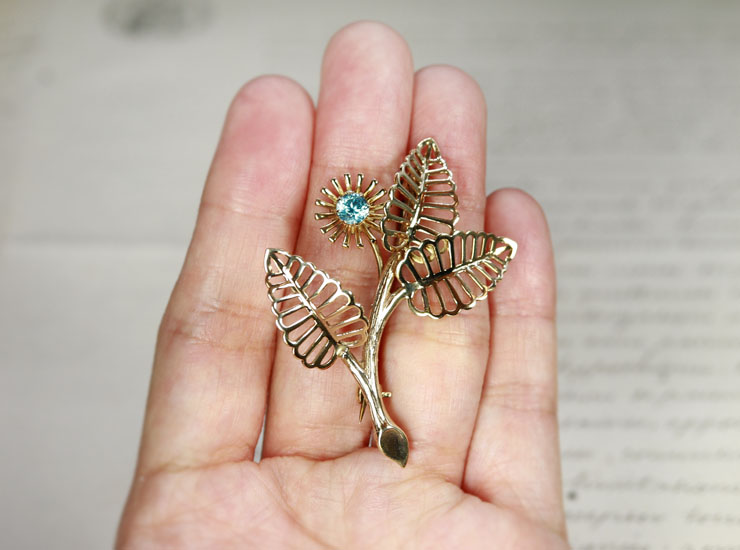 1963年のイギリス製ヴィンテージブローチ。鮮やかな蛍光ブルーのジルコンの花が可愛らしいブローチです。ジルコンはその名前から人口石のキュービックジルコニアと間違われてしまうことがありますが、れっきとした天然の宝石です。強い輝きが特徴で、地球最古の鉱物と言われています。