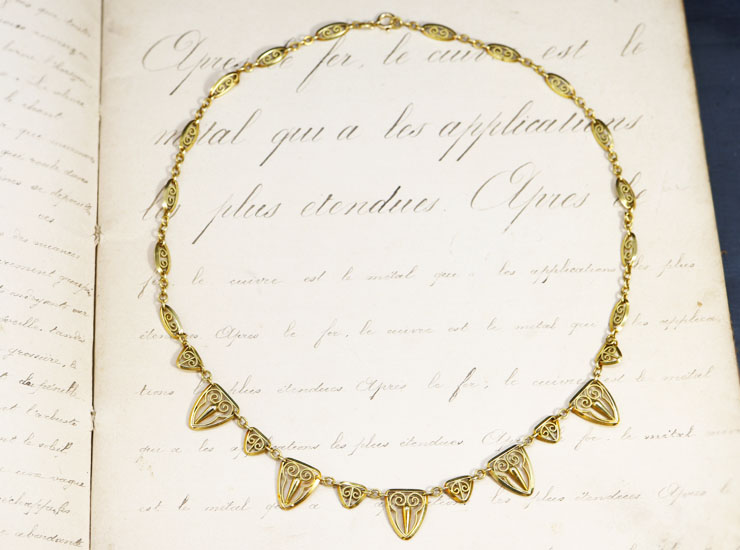 1900年頃のフランス製アンティークネックレスです。ゴールドの糸で編んだレースのようなクラシカルなネックレスです。大小の三角形と楕円形の3種類のパーツでできてきます。三角形(大)パーツは縦13ミリ×横11ミリ、三角形(小)は縦6.5ミリ×横7.5ミリ、楕円形パーツは縦5ミリ×横10.5ミリ。留め具まで含めたネックレスの全長は44センチ。ネックレスの細工は裏表なく、どちらとも同じ模様になっています。