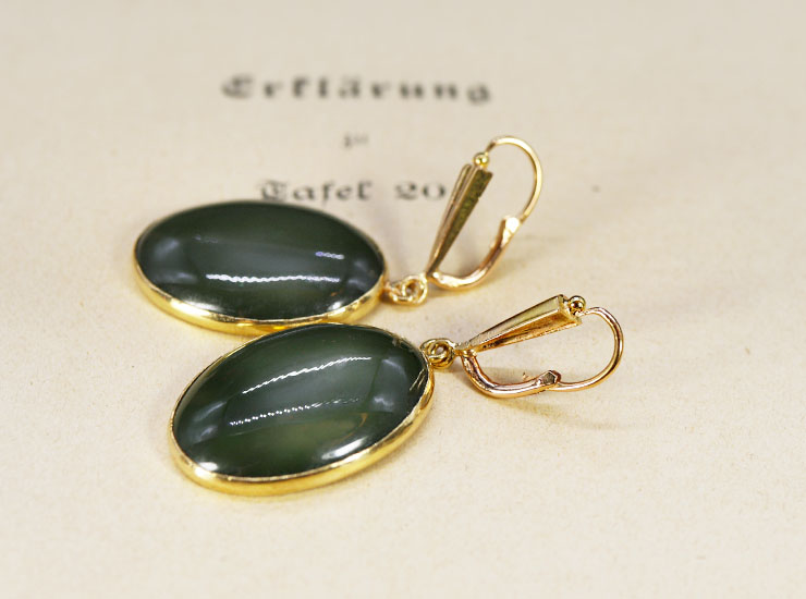 1950年頃のフランス製ヴィンテージピアスです。くすんだ緑色の大きな石はネフライトです。これほど大きな天然石のドロップピアスはなかなかありません。撮影時の光や反射で、石の表面が白っぽく傷があるように写っていますが、実物はこっくりと黒味を帯びた濃厚な緑色で、つるんと艶があります。傷も目立ちません。
