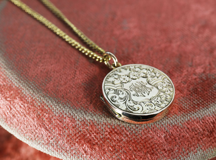 1900年頃のイギリス製アンティークロケットペンダントです。表と裏に素晴らしい彫金が施されています。草花の間には、肉眼では見えないような非常に細い線が隙間なく彫られています。こうすることで光の反射が抑えられて、陰影が生まれ模様が浮かび上がります。表には、元の持ち主のイニシャル(モノグラム)が彫られています。