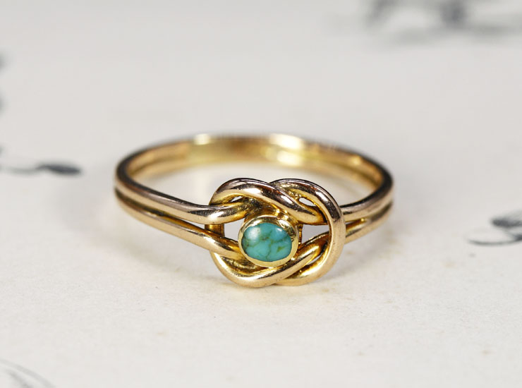 1890年頃のイギリス製アンティークリングです。ノット(結び目)は大切な人との縁や絆のシンボルとして、イギリスで古くからジュエリーのモチーフとして用いられてきました。ノットの真ん中には、鮮やかなブルーグリーンのターコイズが一石。ノットのくるんとした曲線ラインに、小粒ながらくっきりとした色合いのターコイズがアクセントとなり、強く結ばれた絆が表現されています。ターコイズの大きさは約3ミリ。