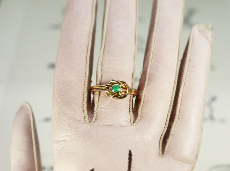 地金は15金。リングの後ろまで2本の紐が重なったようなデザインになっており、サイズ直しはなるべく避けた方がいいと思います。サイズ直しをご希望の方はご相談ください。「15ct」と15金のタグがノットの裏に付いています。アンティークネックレスに時々見られるタイプの刻印で、リングではちょっと珍しい刻印の入れ方です。