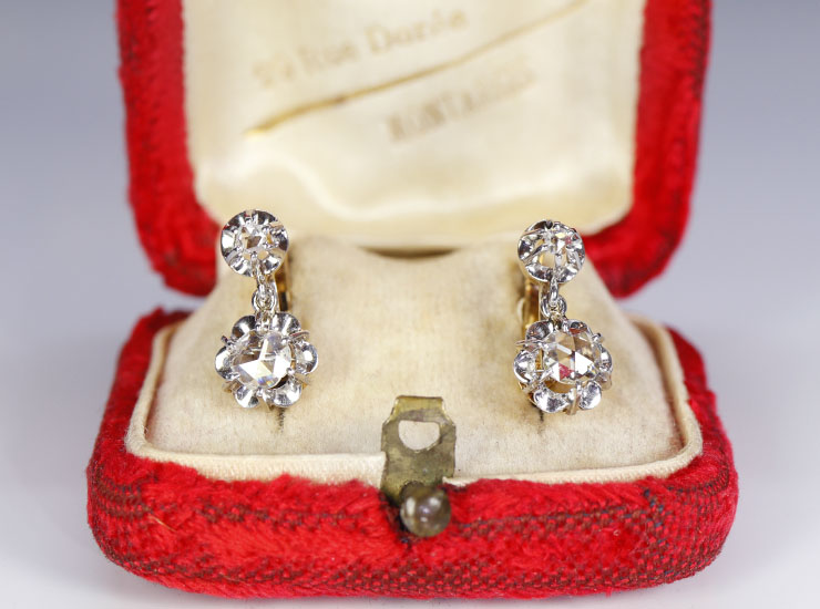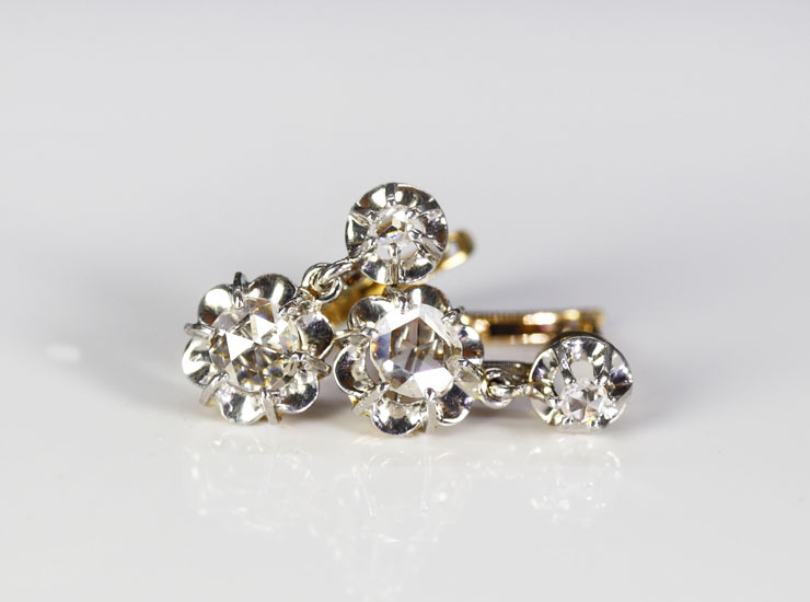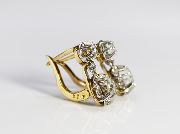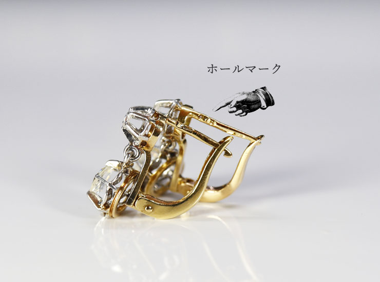 地金はダイヤのセッティング部分は18金ホワイトゴールドで、それ以外は18金イエローゴールドです。メインのダイヤの大きさは約4ミリで、上のダイヤは1.5ミリ×2ミリ。(当時のローズカットで、現代のダイヤモンドとは違い、完全な円形ではないため大体の大きさとなります。)留め具が上下に開閉するレバーバックタイプで、どの角度から見ても美しいデザインです。鏡を見るのが楽しくなる素晴らしい輝きのダイヤモンドピアスです。