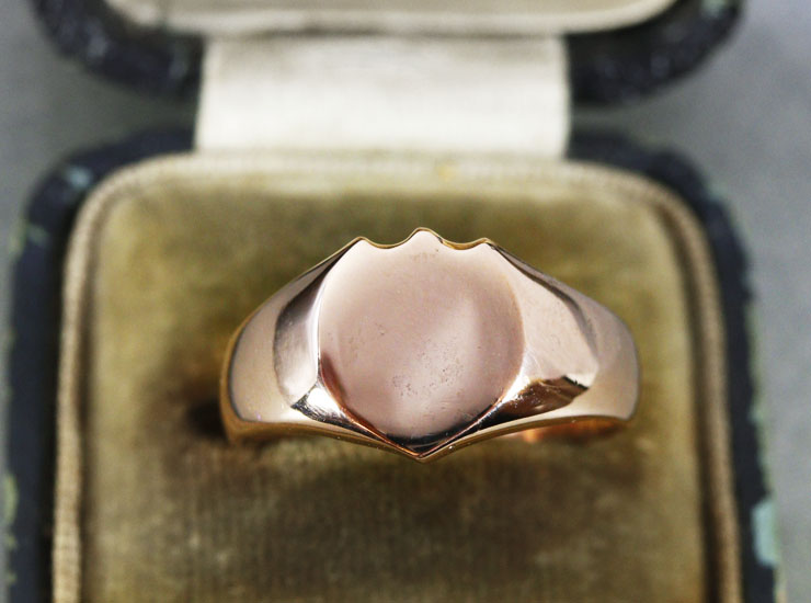 1907年のイギリス製アンティークシグネットリングです。コロンと丸みを帯びたシールドシェイプ(盾型)。モノグラムが彫られていない、アンティークとは思えないほど使用感が非常に少ないリングです。アンティークリングに、オリジナルのモノグラムを入れてみてはいかがでしょうか。