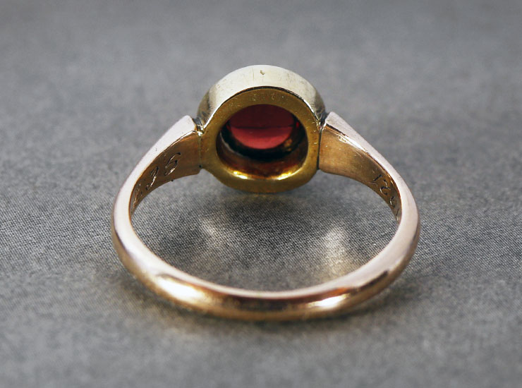 1921年のイギリス製アンティークリングです。ぷるんと果実のようにみずみずしくも濃厚な赤。艶やかな照りが美しいアルマンディンガーネットです。シンプルなデザインのリングの内側には「G.C.W. & L.M.W. to L.G.W. Aug 9th d1921」(G.C.W.とL.M.W.からL.G.W.へ。1921年8月9日)と手彫りで刻まれています。3人とも名字が「W」なので、身内から贈られたリングのようです。誕生日祝いでしょうか。100年も前の、見知らぬ人々の幸せな光景がふわふわと浮かび、胸が温かくなります。リングは大切にされていたのでしょう。摩耗が少なく、とても100歳とは思えません。