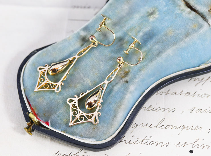 地金は9金。明るい色調のイエローゴールドです。ネジ式で、モチーフ、ネジ部分すべて9金です。アラベスクモチーフに、ティアドロップが揺れ動くデザイン。モチーフの大きさは縦34ミリ×横18ミリ。重量は4.3グラム。程よい厚みがありしっかりとした作りですが、透かし模様のため、重苦しい印象はありません。