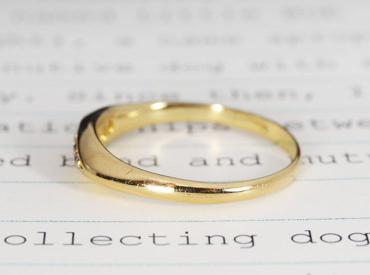 地金は18金イエローゴールド。このようなタイプのリングには通常ホールマークではなく「18CT」などの刻印が入っていることがほとんどですが、こちらのリングにはホールマークが打たれています。サイズ直しをしてしまうとホールマークが一部消えてしまうおそれがあるため、サイズ直しがいらない方にお勧めのリングです。細身のリングで、一番細い箇所は幅2ミリで、フロント部分は幅4.6ミリ。