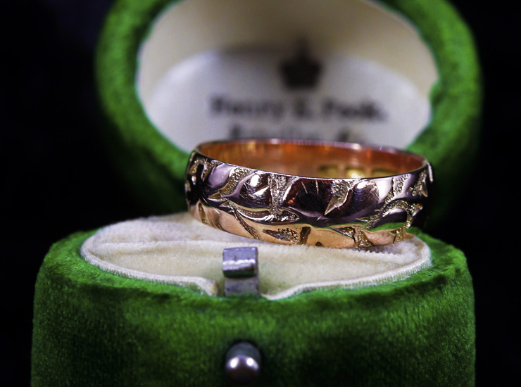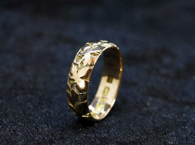 1918年のイギリス製アンティーク結婚指輪です。美しいピンクを帯びたゴールドに、手彫りでぐるりと一周植物の模様が施されています。葉は光沢のある鏡面仕上げなのに対し、模様の間は細かな粒のテクスチャーで立体感を強調し、美しい陰影が生まれます。