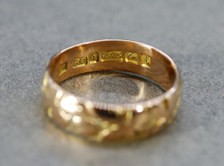 リングに9金、1918年を示すイギリスのホールマーク(刻印)、メーカーマーク入り。アンティーク9金結婚指輪は良い状態です。