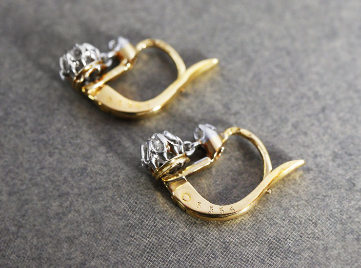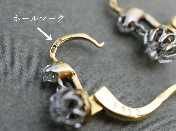 ピアスにフランスの18金のホールマーク(鷲の頭)入り。アンティーク18金ダイヤモンドピアスは良い状態です。