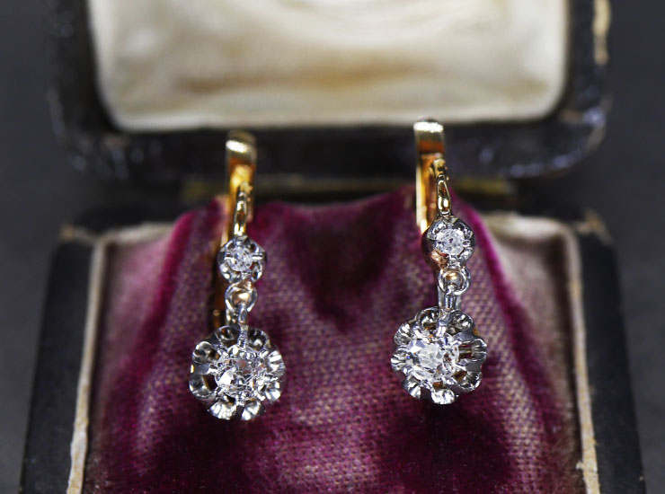 1910年頃のフランス製アンティークピアスです。コロンと厚みのあるダイヤモンドから発せられる輝きが華やぎを与えてくれます。メインのダイヤモンドは、オールドマインカットとオールドヨーロピアンカットの間のようなカットで直径約3ミリ。上の小さなダイヤモンドは1.5ミリ。大きなダイヤモンドではありませんが、ほとばしる光を放つように揺れ動き、身につけるだけでお顔を一段階明るく見せてくれます。