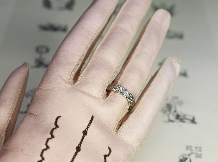 1976年頃のフランス製ヴィンテージリングです。リングの全周ぐるりと模様が施されています。リングの内側にはイニシャルと日付「3-4-76」(1976年4月3日)が刻まれており、おそらく結婚指輪だったと思われます。