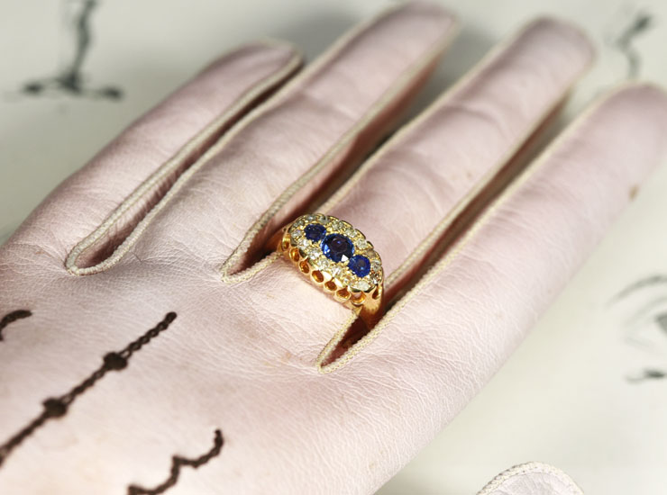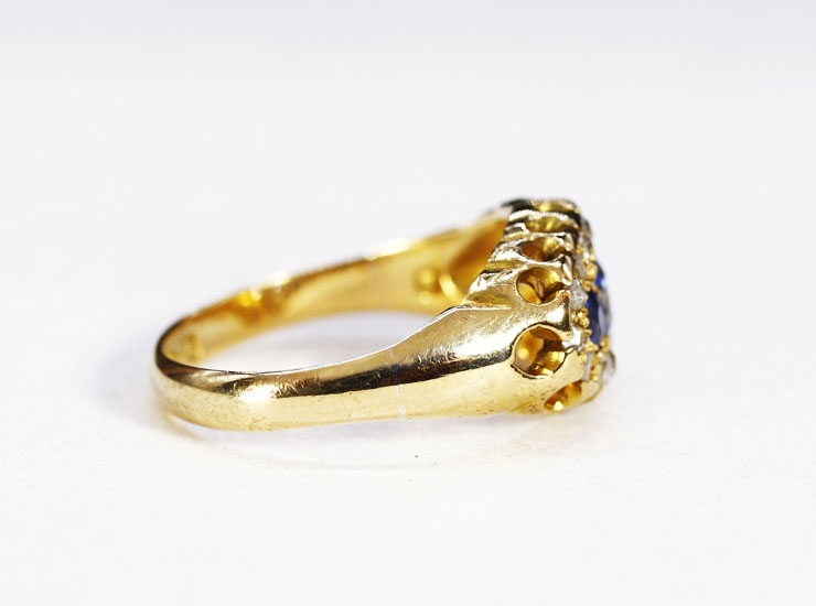 リングに18金、1905年を示すイギリスのホールマーク(刻印)入り。真ん中のサファイアに肉眼ではまったく確認できない程度の非常に小さなカケがあります。リングは全体的に良い状態です。