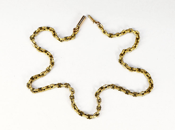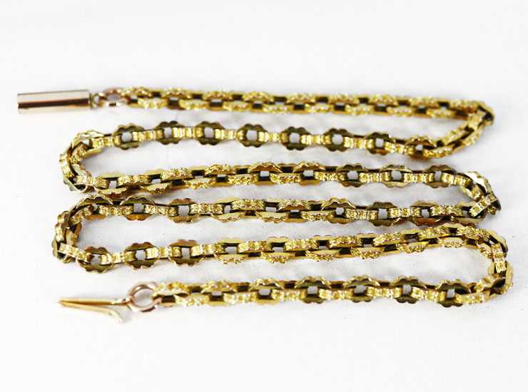 1860年頃のイギリス製。立体的な細工が美しいハンドメイドのアンティークチェーンです。機械のない時代に、ひとつひとつパーツを作り組み合わせる、その高い技術と費やされた労力に驚かされます。チェーンは立体的で厚みがありますが、実際に手に取ると見た目よりも軽い作りです。軽いといっても10グラムもありますが、このようなアンティークチェーンは中が空洞の作りになっていて、見れば見る程どうやって作ったのかしら、と不思議になります。