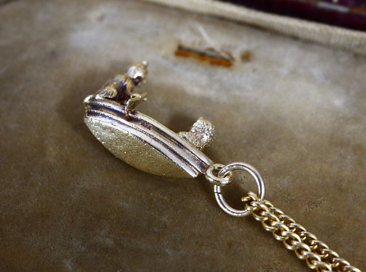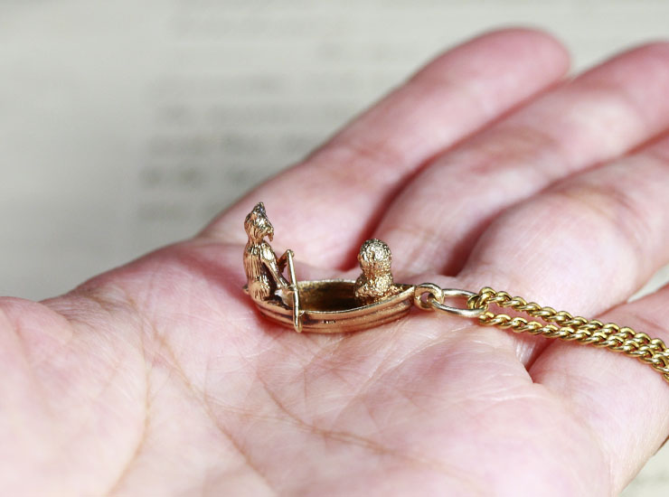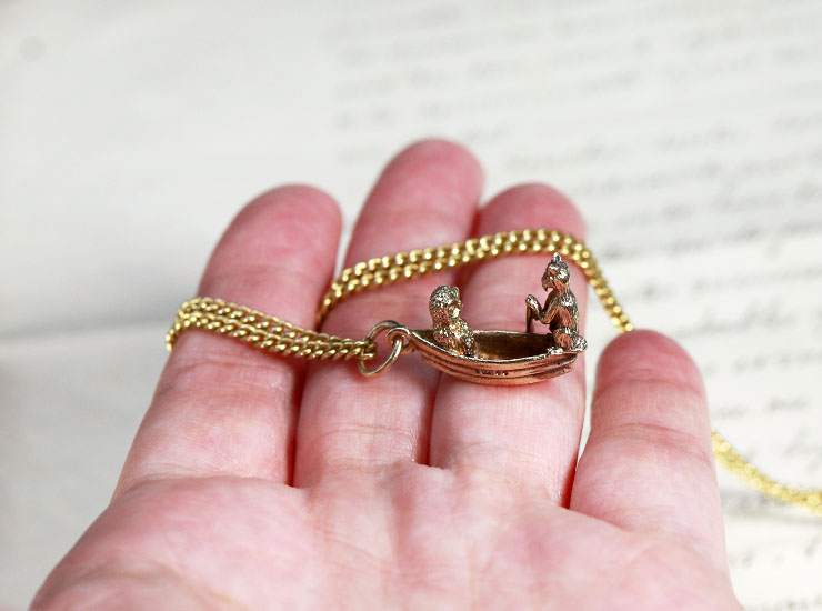 1970年のイギリス製ヴィンテージチャームです。小舟に乗ったふくろうと猫。不思議な組み合わせですが、この二人は恋人同士なのです。イギリスで1871年に出版された「The Owl and the Pussycat」(ふくろうと猫)という詩のワンシーンがモチーフになっています。