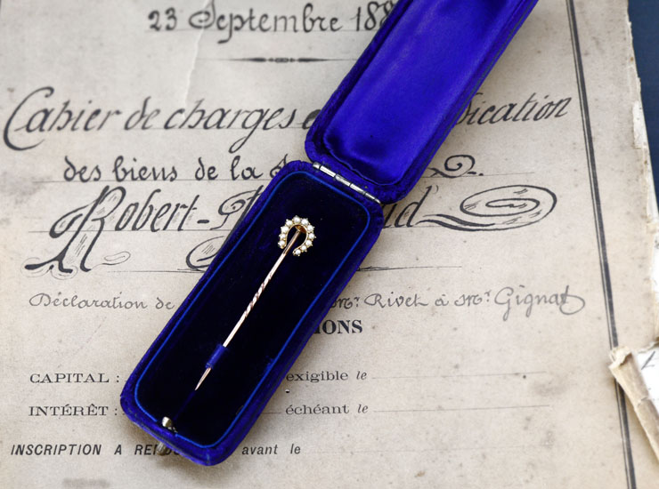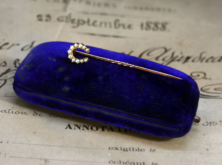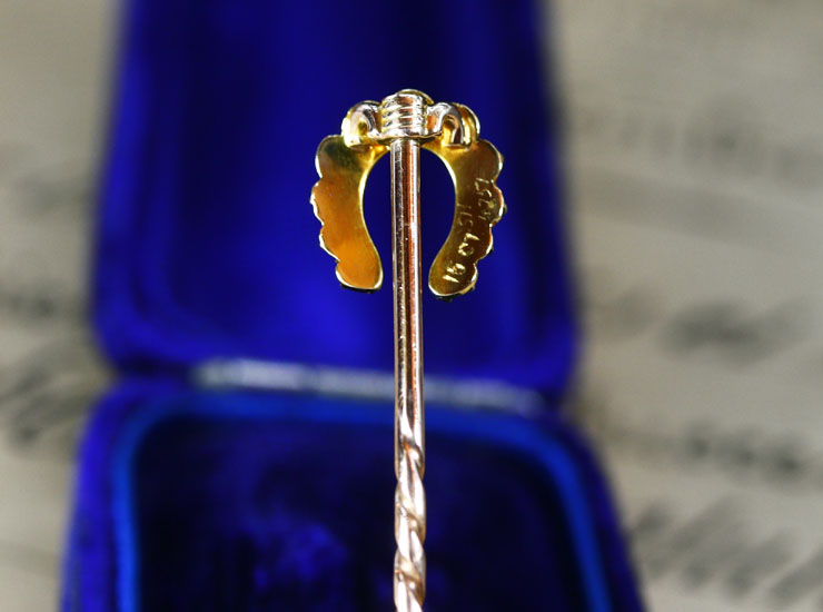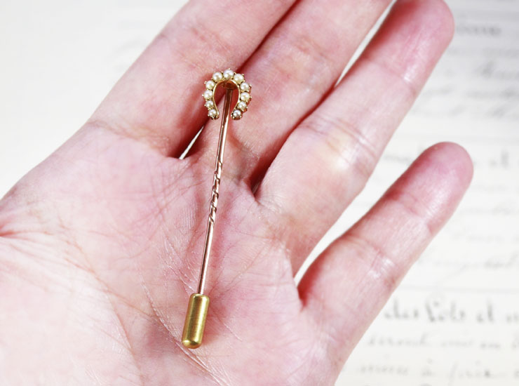 1900年頃のイギリス製のアンティーククラバットピンです。幸運を呼ぶラッキーモチーフとして古くからジュエリーのデザインに取り入れられてきたホースシュー(馬蹄/蹄鉄)に、艶々のシードパールが留められています。