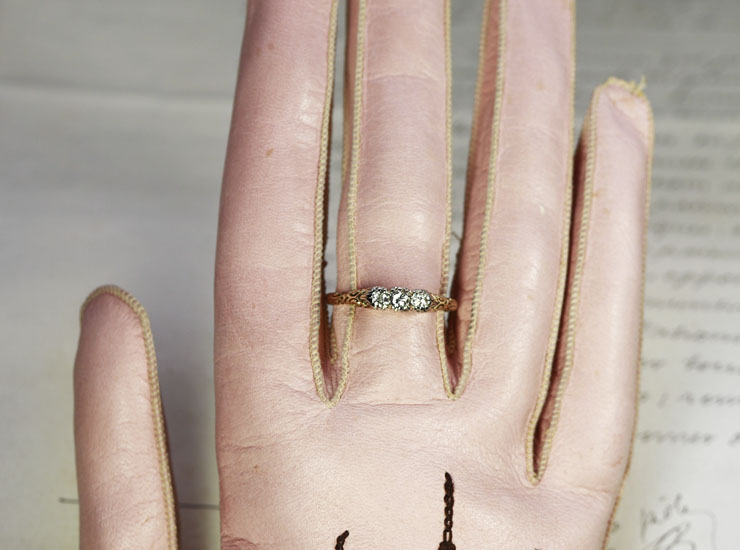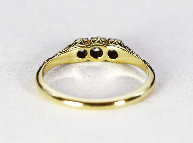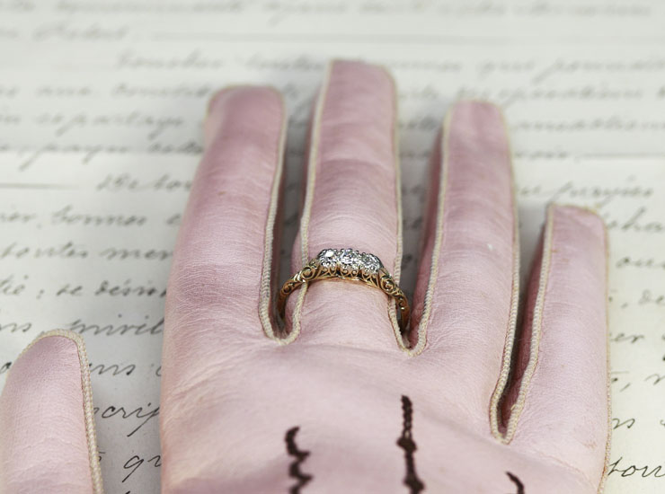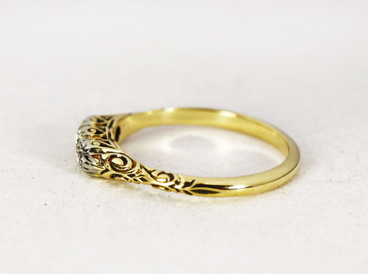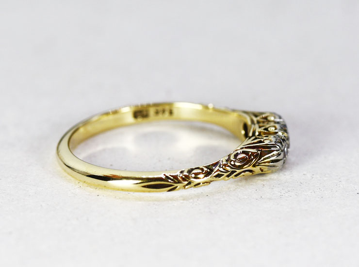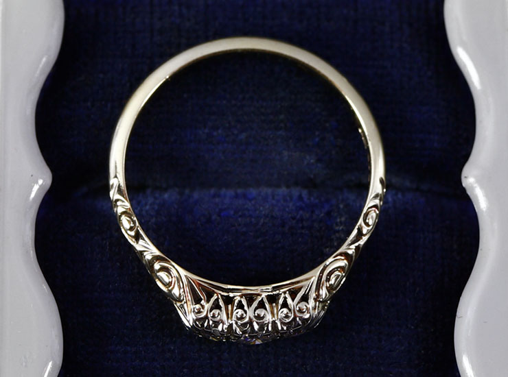 1930年頃のドイツ製。美しい輝きのダイヤモンド3石に負けない見事な細工が施されたリングです。模様に浮かび上がる陰影が本当に綺麗。正面はもちろん、横、斜め、上、下とどこから見てもうっとりする美しさで、色んな角度から眺めたくなります。