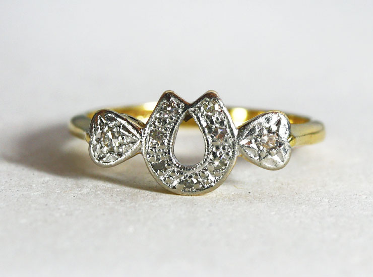 1920年頃のイギリス製アンティークリングです。幸運を呼び込むとお守りとして身に着けられてきたホースシューにダイヤモンドがあしらわれています。ホースシューの両サイドにはハートが寄り添っています。ホースシューにはダイヤモンドが7石(ラッキーセブン)、ハートにはそれぞれ1石ずつのダイヤモンドがセットされています。