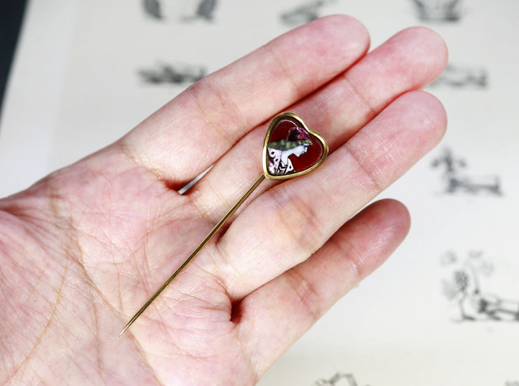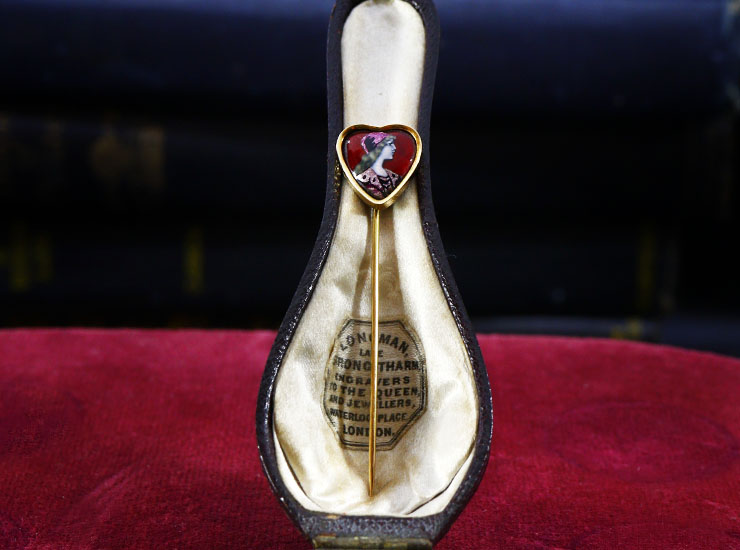 1910年頃のフランス製。ジプシー女性の横顔が描かれたリモージュエナメルのクラバットピンです。独特の美しい色彩が楽しめるのがリモージュエナメルの醍醐味です。光沢のある赤色の背景に、鮮やかな衣装の女性が小さなハートに描かれ、リモージュエナメルジュエリーの中でも可愛らしい作品となっています。裏に作者のサイン入りです。