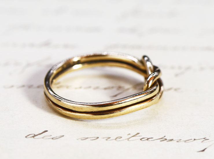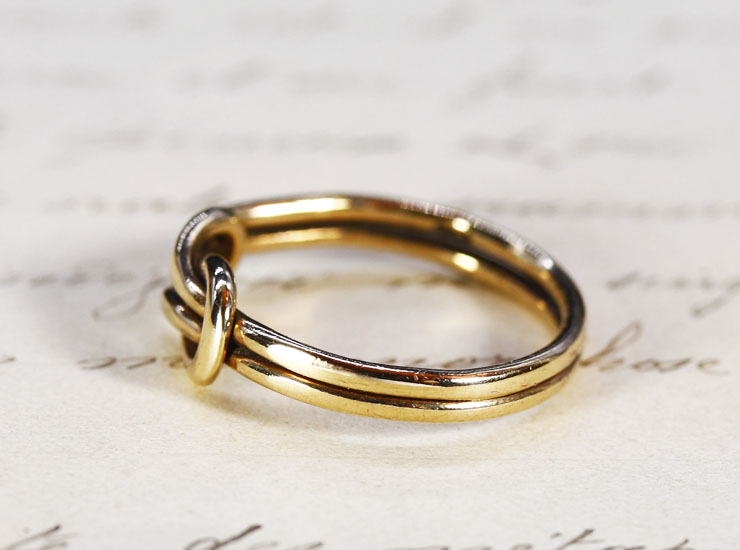 1978年のイギリス製ヴィンテージリングです。大切な人との絆や縁を結ぶという意味が込められたKnot(結び目)がモチーフのリングです。2本のリングがギュッと結ばれたような立体的なフォルムは主張しすぎないのに、実際に身につけると個性が光ります。