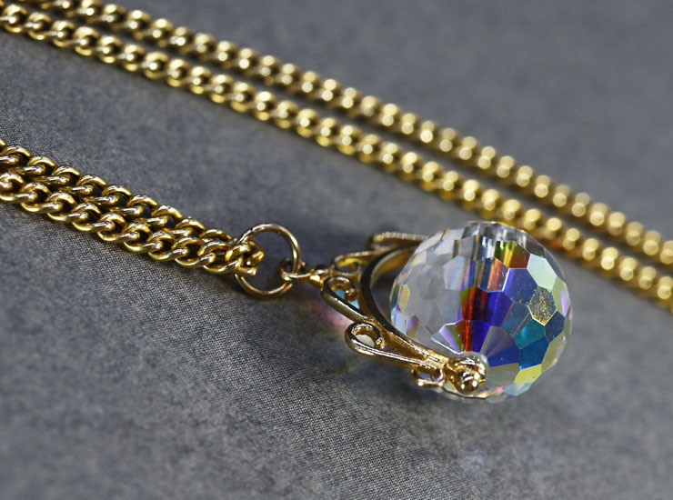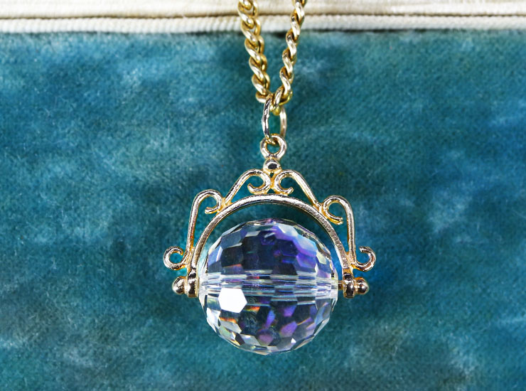 1970年頃のイギリス製ヴィンテージチャームです。多面カットの丸いガラスが回転する作りになっています。くるくると回転しながら光を反射し、虹色の輝きを見せてくれます。その姿は神秘的で、光に包まれた惑星を思わせます。