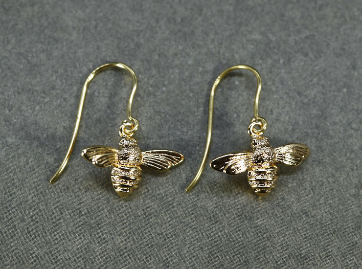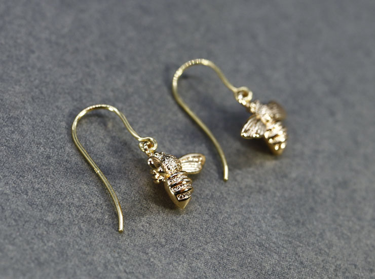 地金は9金。明るい華やかな色合いのゴールドです。蜂の大きさは縦9.5ミリ×横16.5ミリ。ドロップ部分を含めた全長は約21ミリ。大きすぎず、小さすぎずちょうど良い大きさで、程良いボリューム感(厚み)もあります。耳元でぶんぶんと飛ぶ可愛らしいマルハナバチはゴールドの光沢も美しく、お出かけが楽しくなりそうです。