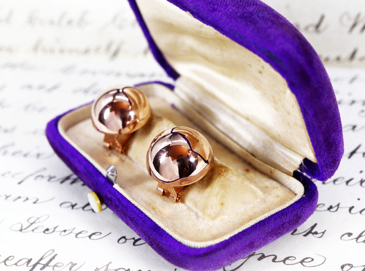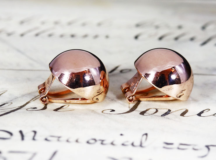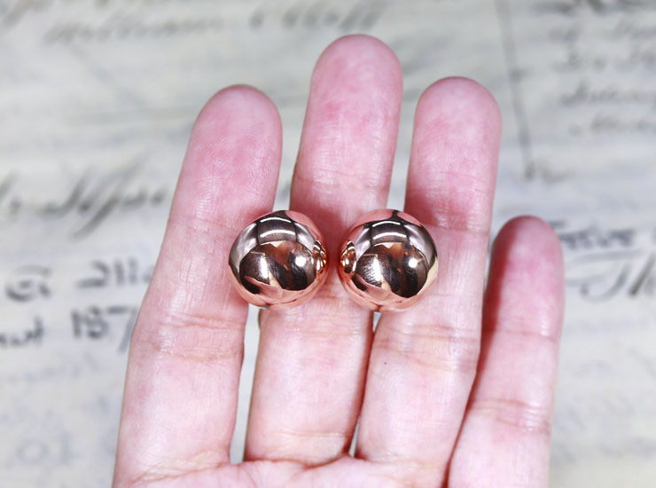 1970年頃のイギリス製イヤリングです。つるんと滑らかな大きな半球体。究極にシンプルでありながら、主役級の存在感で、ひとつ身に着けるだけでインパクトがあります。地金は9金。ピンクを帯びた可愛らしい色合いのゴールドです。留め具は、耳たぶを挟むクリップ式。