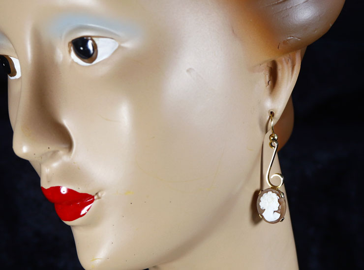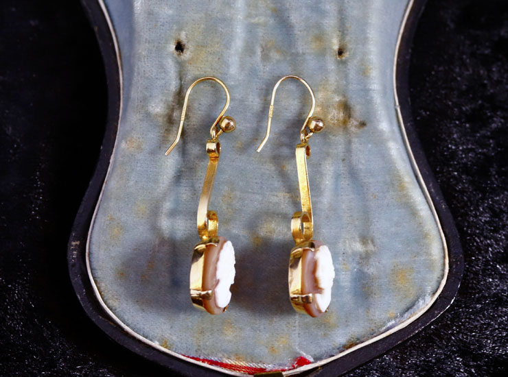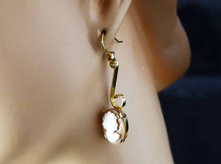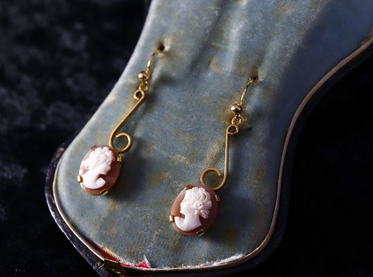 地金は9金イエローゴールド。カメオの大きさは縦12ミリ×横10ミリ。ドロップ部分は27ミリ。着用時のピアス全長は38ミリ。ニュアンスカラーの優しい色のカメオは、女性らしさをプラスしてくれます。縦長ラインの優美なフォルムに心奪われる素敵なヴィンテージピアスです。