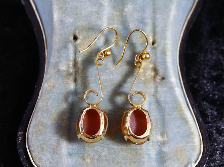 ピアスに9金、1972年を示すイギリスのホールマーク(刻印)、メーカーマーク入り。ヴィンテージ9金カメオドロップピアスは良い状態です。※こちらの商品はレターパックプラスでお届けいたします。お届け日時のご指定ができませんので、あらかじめご了承ください。