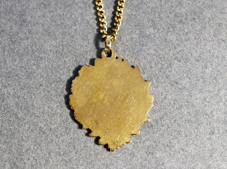 地金は18金。写真では反射や写り込みにより黒っぽく見えますが、18金以上ありそうな濃厚で綺麗な色合いのゴールドです。メダイの大きさは縦27ミリ×横23ミリ。バチカンを含めた着用時の全長は33ミリ。裏に僅かにヘコみがありますが、裏ですので気になりません。芸術性が感じられる美しいアンティークゴールドメダイです。