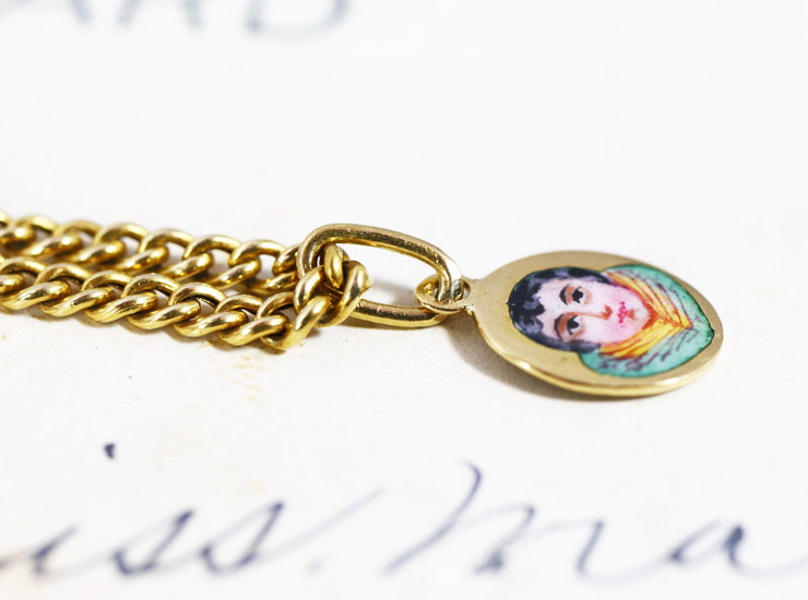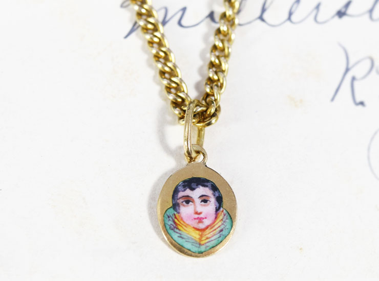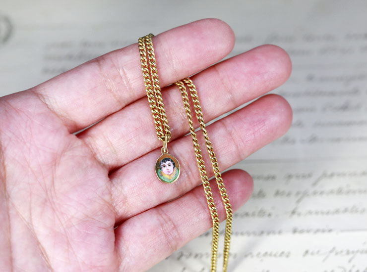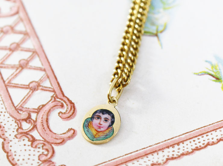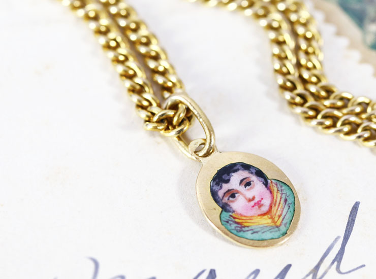 1900年頃のフランス製アンティークペンダントです。わずか縦9ミリ×横7.5ミリの小さなペンダントに鮮やかに描かれた可愛らしい天使。エナメルはガラス質の顔料を土台(金など)に高温で焼き付ける技法で、小さな面積に細かな絵を描くには、より高度な技術を要します。拡大して撮影していますので、それほど小さくは見えませんが、実物を見るとよくもこんな小さなスペースにエナメル画を描いたものだと関心させられます。