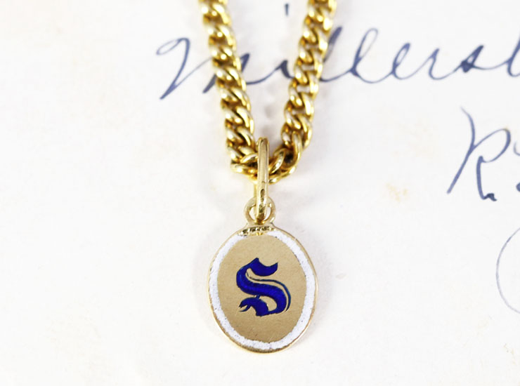 地金は18金イエローゴールド。表には天使、裏には「S」のイニシャルが描かれています。僅かに色が剥がれた箇所がありますが、全体的に良い状態です。お守りになりそうな小さくて可愛らしいペンダントです。