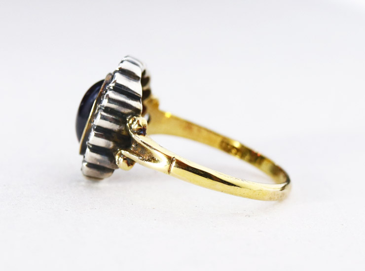 リングに「15ct」と15金の刻印入り。ヴィクトリアン15金ガーネットダイヤモンドリングは良い状態です。