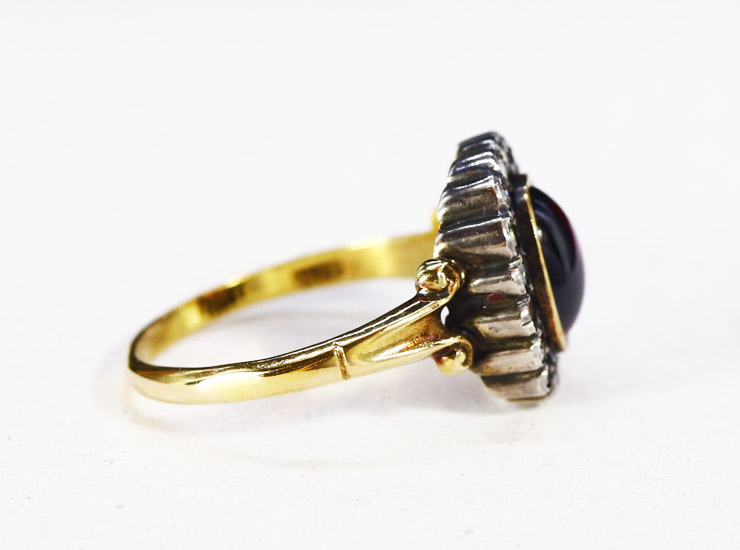 地金はダイヤモンドの石座はシルバーで、ガーネットの周囲(覆輪留め)とリング全体は15金イエローゴールド。石座はボリュームがあり、アームはほっそりとしたデザインになっています。ガーネットはカボションカットで、大きさは縦8ミリ×横6ミリ。フェイスの大きさは縦13ミリ×横11.5ミリ。ダイヤモンドはゴツゴツとした少々ラフなカットですが、美しい輝きを放ちます。