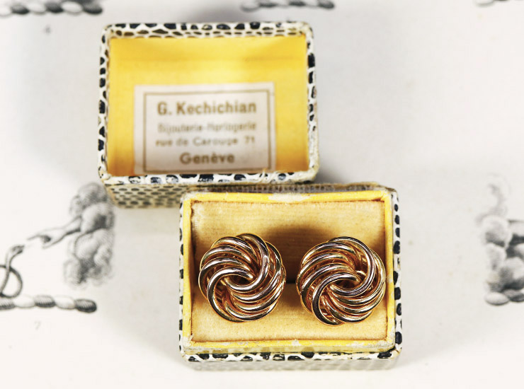 1960年-1970年頃のイタリア製。渦を巻いたような編み目が美しいノットピアスです。丸みを帯びた立体的なフォルムで、やや大きめのタイプでボリュームがある作りですが、細身の束に程よい透け感があり、あまり重々しくなりすぎず柔らかな印象です。