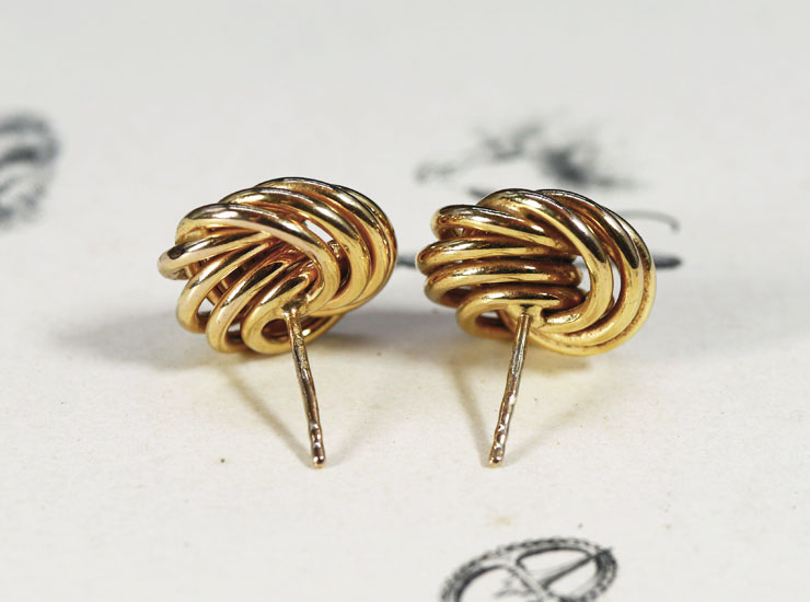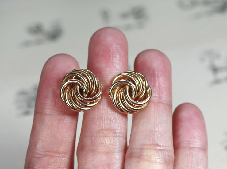 地金は9金イエローゴールド。ピアスの直径は15ミリで、横から見た時のノットの高さは約7ミリ。立体感があり、横顔もチャーミングです。こちらのピアスには、シリコン製キャッチ(留め具)をお付けしてお届けいたします。