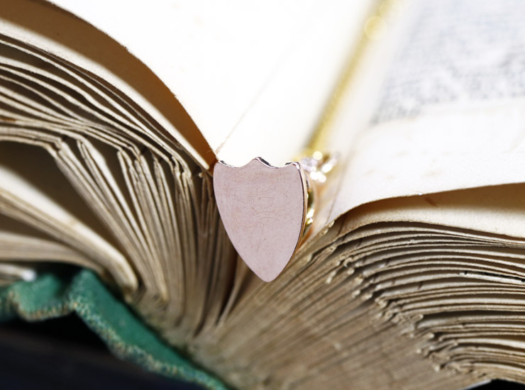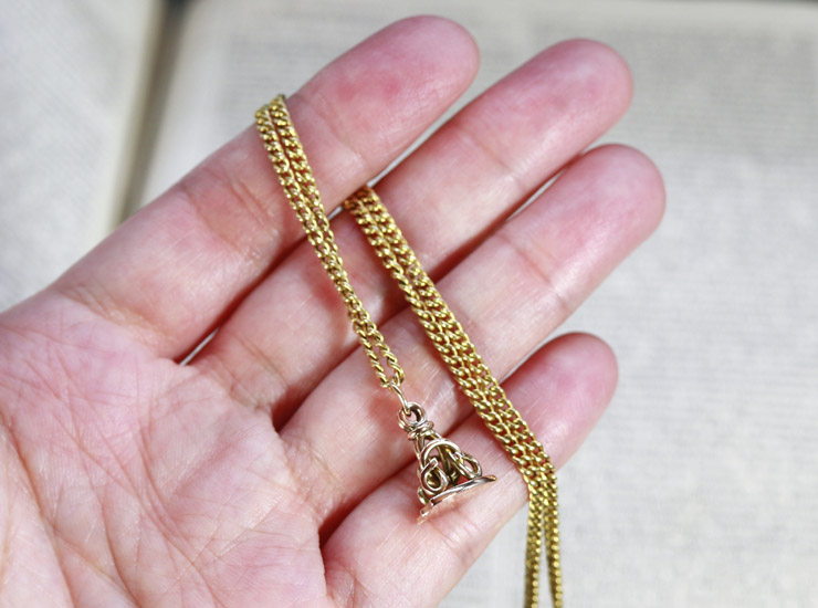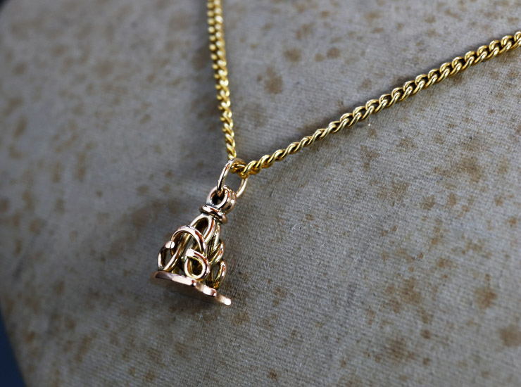 地金は9金。ややピンクを帯びたニュアンスのあるゴールド。底面の大きさは11ミリ×8ミリ。ペンダントは縦11ミリ×横8ミリ。バチカンを含めた全長は17ミリ。指先に乗るほど小さな美しいフォブシールです。
