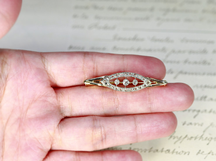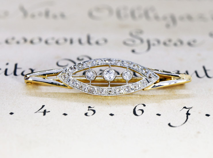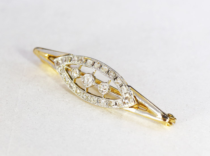 1920年頃のアメリカ製。アールデコのすっきりとしたラインの透かしに、ダイヤモンドが煌びやかに輝く上品なデザインのブローチです。真ん中にオールドヨーロピアンカットのダイヤモンドが3石並び、周囲のボートシェイプのフレームにはぐるりと一周ローズカットのダイヤモンドが留められています。ダイヤモンドの大きさは中央の3石は2ミリ〜2.5ミリ、周囲のダイヤモンドは約1.2ミリ~1.8ミリ。
